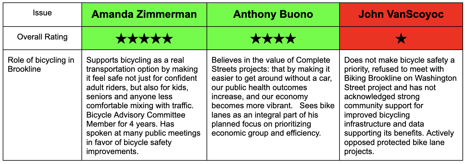 Biking Brookline has rated the three Select Board candidates (who are running for two seats) in a scorecard which contains a star rating and a brief summary of each candidate’s position on key bicycling issues. The ratings represent the unanimous opinion of the Biking Brookline Board of Directors and are based on each candidate’s record and response to the BIking Brookline Candidate Questionnaire. Below the scorecard, you will find a brief narrative adding some additional perspective on each candidate, and, below that, the candidates’ replies to the Biking Brookline Questionnaire.